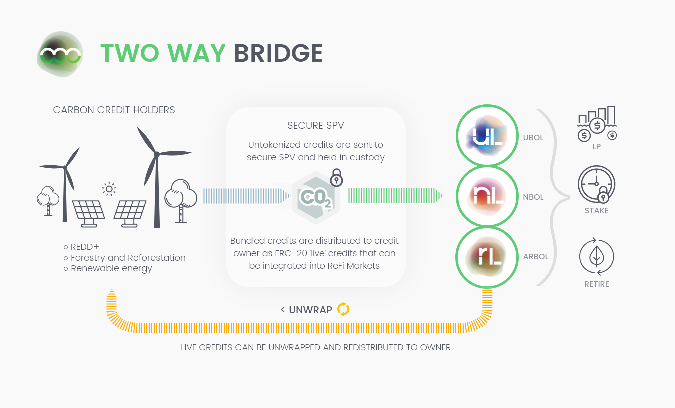 If that tokenized carbon credit is not used on-chain (i.e. it is not retired), it could subsequently be unwrapped and then redistributed to the owner of the credit. Thus enabling greater integration of the on-chain and off-chain carbon market.