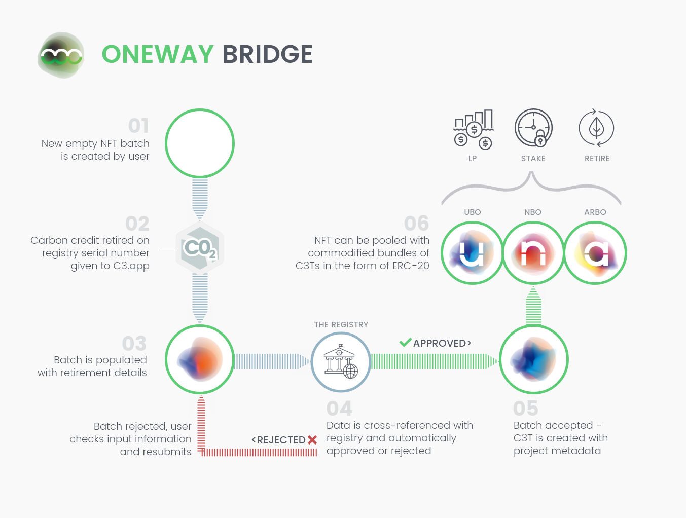 C3 has been working to define new approaches that could unlock additional benefits for the market, one of these is the development of a two-way bridging technology. Two-way bridging technology is similar to that of one-way bridging, in that it gives carbon credits presence on the blockchain in a tokenized (ERC-20) state. However, in the case of two-way bridging, the tokenized carbon credits can be redeemed for unretired, untokenized carbon credits after they have been tokenized.
